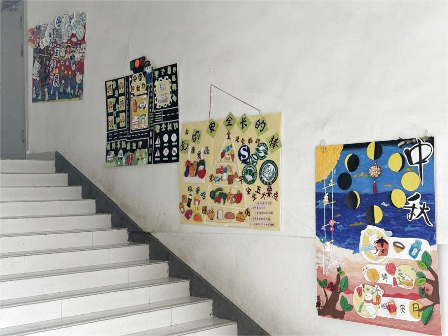 每一件作品都是同学们结合现代审美和环保理念、凝聚智慧与心血完成的。色彩缤纷、形式多样、制作精美的作品悬挂、摆放在教学楼的走廊和楼梯空地,充满了童趣与创造力,体现出了幼儿园环境的设计理念和童趣元素,以及对未来幼儿园教育环境的独特理解和创新思考。