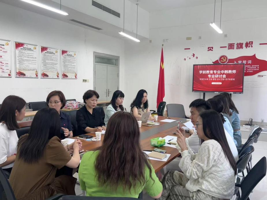 为促进太阳成集团122ccvip中韩合作办学学前教育专业的高质量发展,加强中韩双方教师的深度交流,7月2日下午,公司在2D178会议室召开了中韩教师专业研讨会。韩国仁荷大学金彗羅教授、姜順美教授、姜善暻教授和金京玧教授,幼儿教育公司党支部书记、经理李海英,教研室主任李娜,部分教师参加了本次会议。