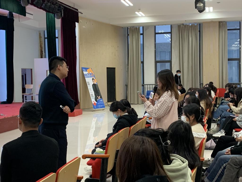 王老师开展了以“我的职业不迷茫”为主题的讲座。如何实现职业不迷茫?王老师首先向同学们强调了能力、学历、勤奋、机遇对于求职的重要性;又以“如何高效求职”这一话题,向同学们展示了高效求职的“三部曲”,为同学们明确了努力的方向;同时,王老师还从如何制作一份优秀的简历、面试技巧、面试注意事项、面试礼仪等方面为同学们做出了详细解答。王老师通过轻松幽默的语言和现场同学进行良好互动,同学们都积极回答问题,全场气氛活跃。