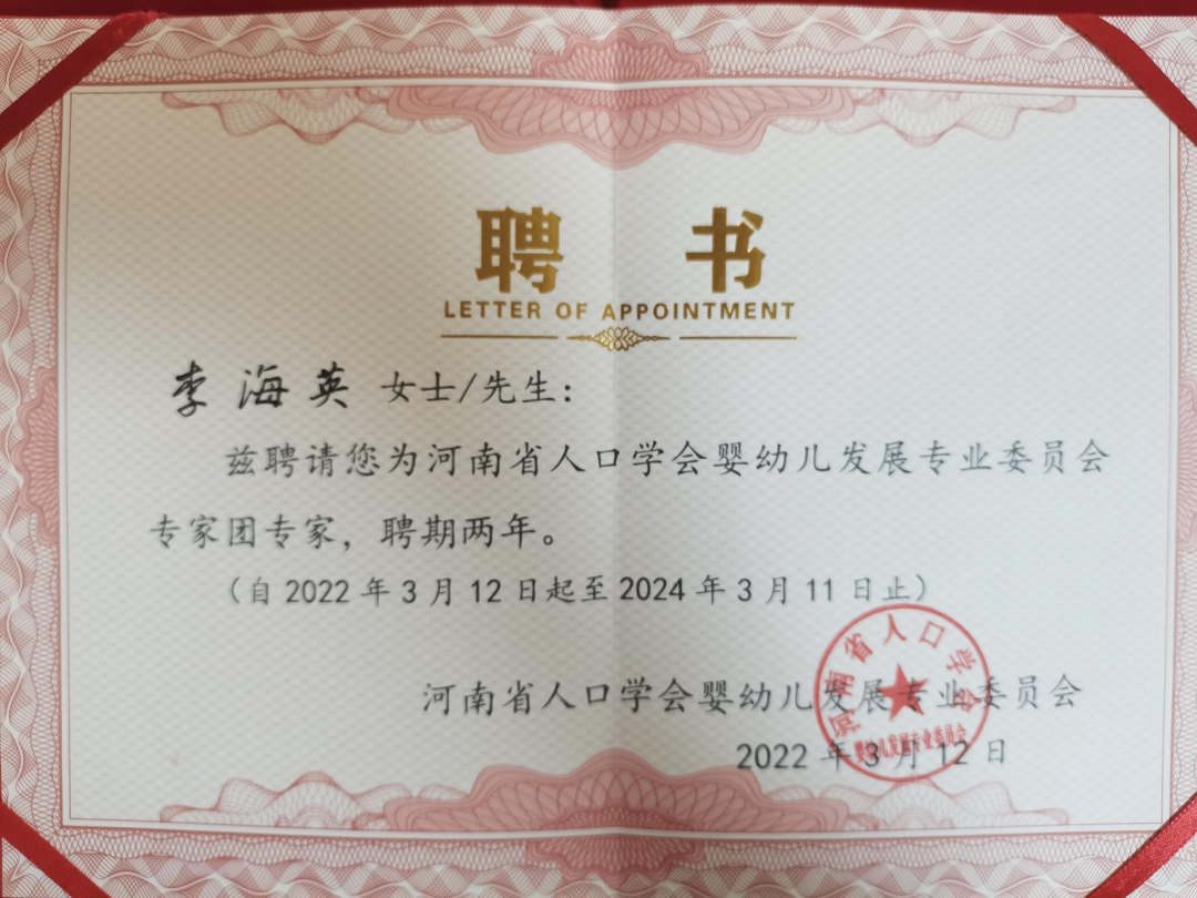 2022年3月12日,人人持证,技能河南,全国家庭服务行业职业技能人才创新与发展高峰论坛暨妇幼老“1+X”2021年度河南省工作总结表彰大会,在河南卫生健康干部公司隆重召开。参加本次会议的有来自全省的各高职院校的领导、骨干教师,还有行业专家。在本次会议上,公司太阳成集团122ccvip被评为2021年1+X幼儿照护优秀考核站点,太阳成集团122ccvip副经理李海英被推荐为河南省人口学会婴幼儿发展专业委员会专家。