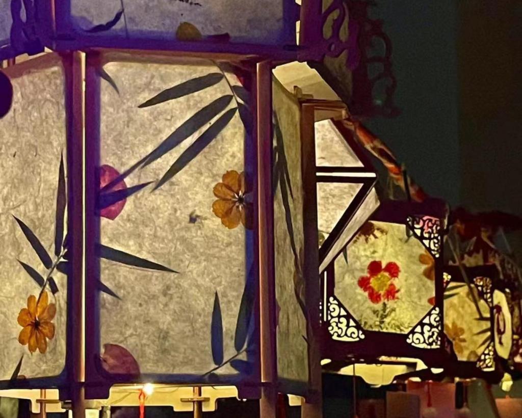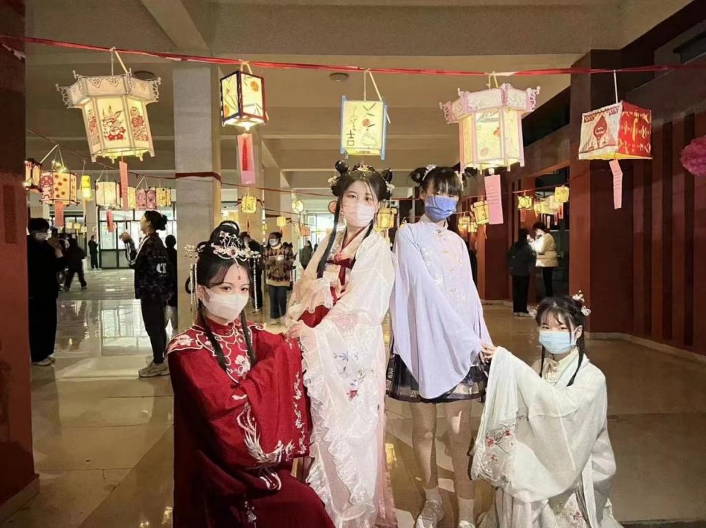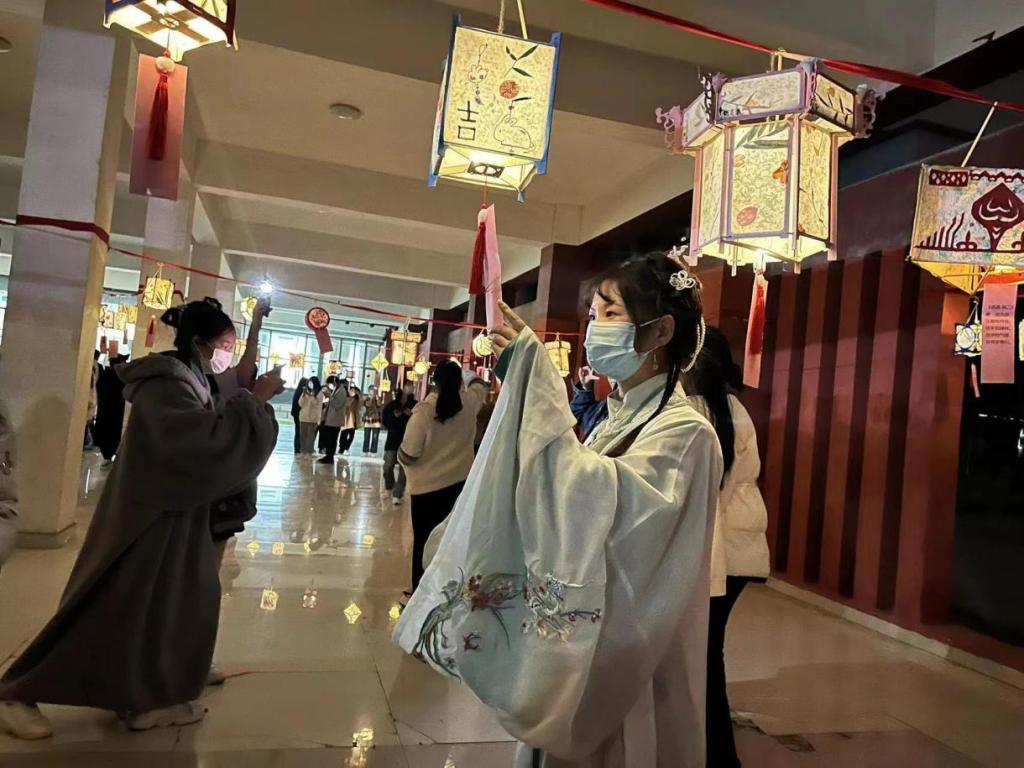 夜幕降临,一盏盏灯彩被点亮了,这些灯笼都是出自21级学前教育专业员工之手,从花草纸的制作到灯笼骨架的扎制,从花草纸的裱糊再到灯笼的装饰,都是员工们在手工课上精心完成的。每一个灯笼的下方都悬挂了一首古诗,让来参加活动的同学们在欣赏灯笼的同时又重温了一遍曾经背诵过的古代诗词,浓浓的传统文化氛围在这个夜晚伴随着斑斓的灯光、悠扬的音乐荡漾在整个校园。