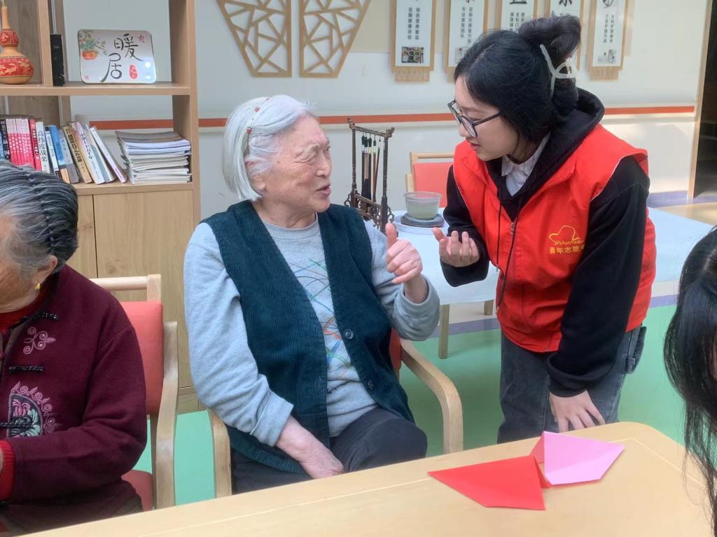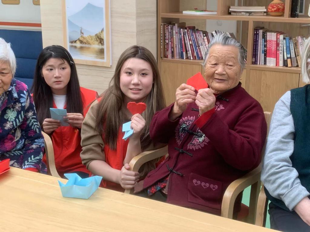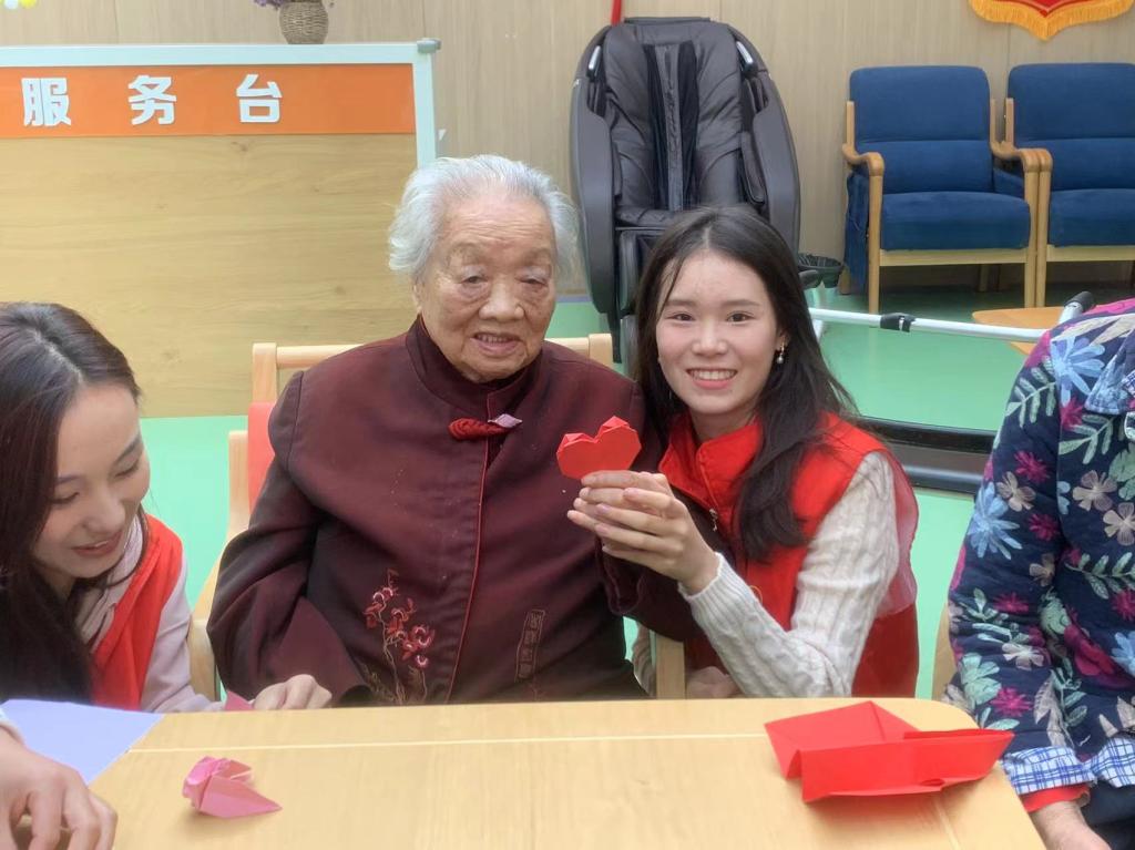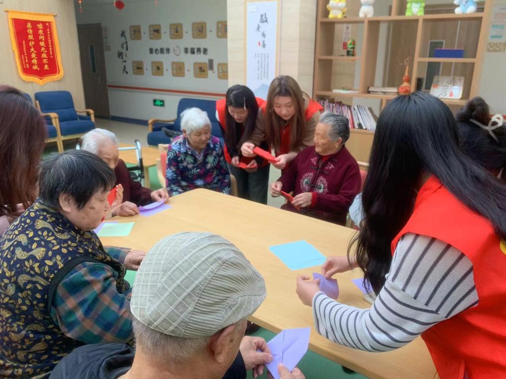 接着,志愿者和老人们一起进行手工折纸互动,老人们热情高涨,十分专注,认真地学习每个步骤,并小心翼翼的将纸折叠出所需要的形状,当老人们完成了自己的手工作品时,脸上洋溢着孩子般的笑容。最后,丁鼎用一首《幸福歌》为今天的志愿活动画上了圆满的句号。