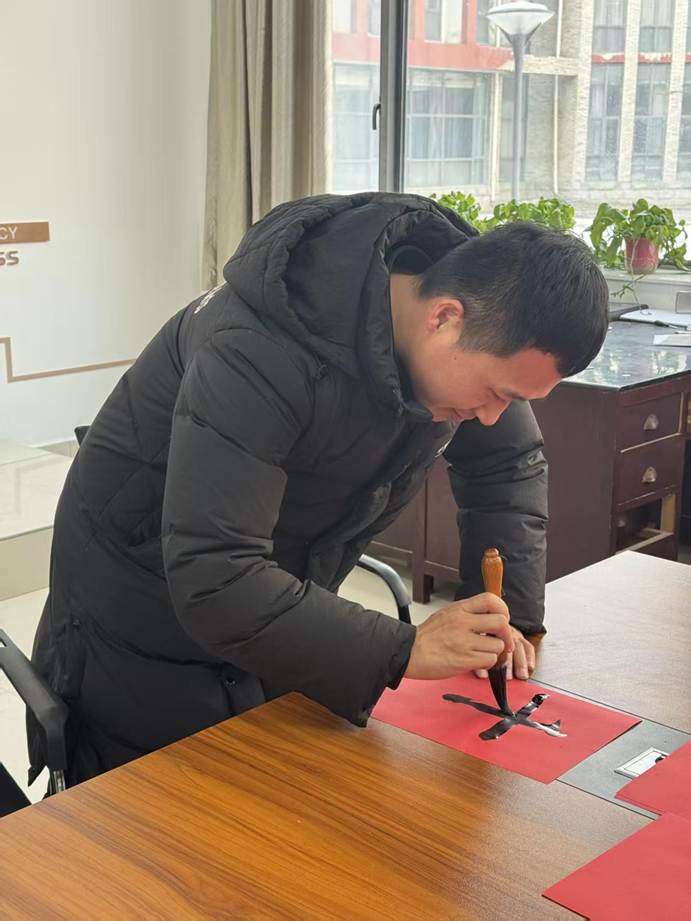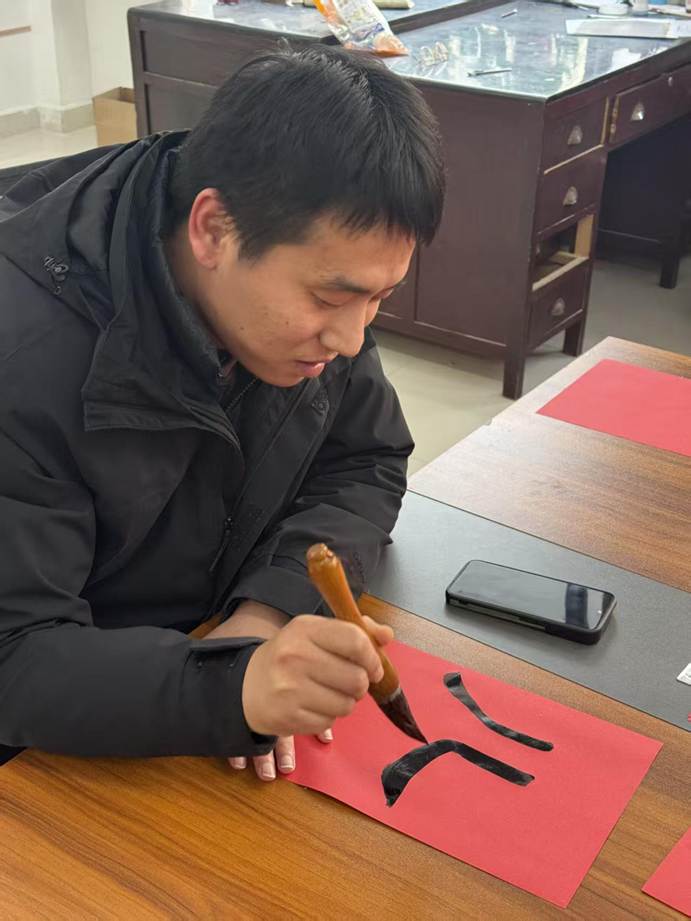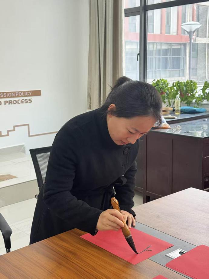 联欢会现场热闹非凡,上午狼人杀思维交锋、笑语不断;掼蛋搭档切磋、指尖欢弈,老师们互动暖心,满室融融;下午,红纸铺展,笔墨凝香,老师们挥毫书写春联,一撇一捺寄新春祝福,一笔一划藏美好期许,尽显传统年味。